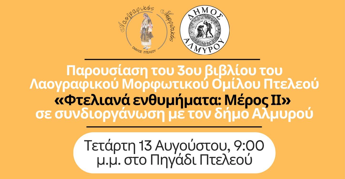 Ο Λαογραφικός Μορφωτικός Όμιλος Πτελεού σε συνδιοργάνωση με τον Δήμο Αλμυρού, παρουσιάζουν το 3ο Βιβλίο της σειράς “Φτελιανά Ενθυμήματα: Μέρος ΙΙΙ” την ΤΕΤΑΡΤΗ 13 ΑΥΓΟΥΣΤΟΥ στο ΠΗΓΑΔΙ ΠΤΕΛΕΟΥ & ώρα 9μμ.